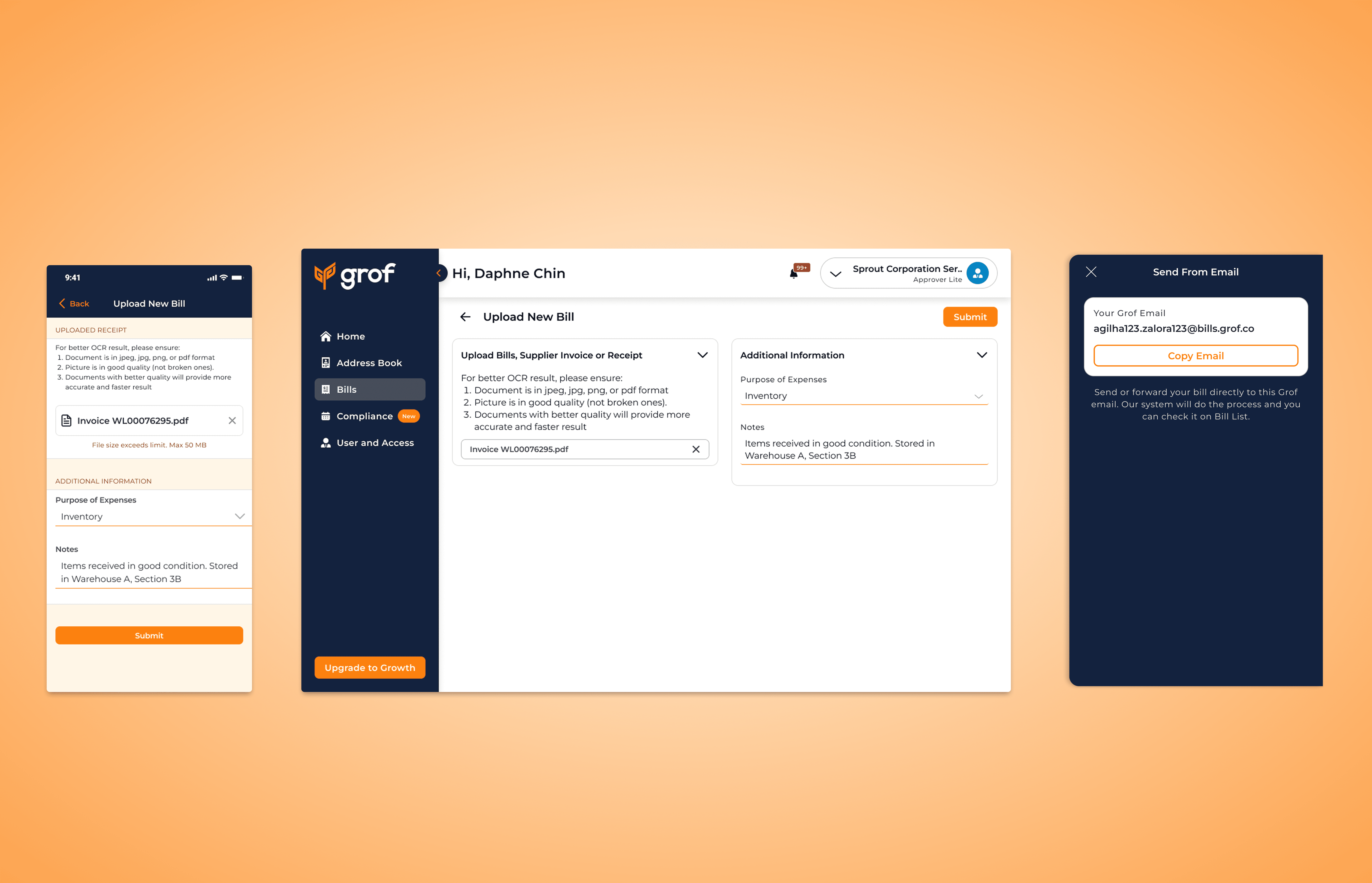 Introduced optical character recognition (OCR) for invoice uploads, minimizing human error. Users could upload bills directly in-app or forward them via email.