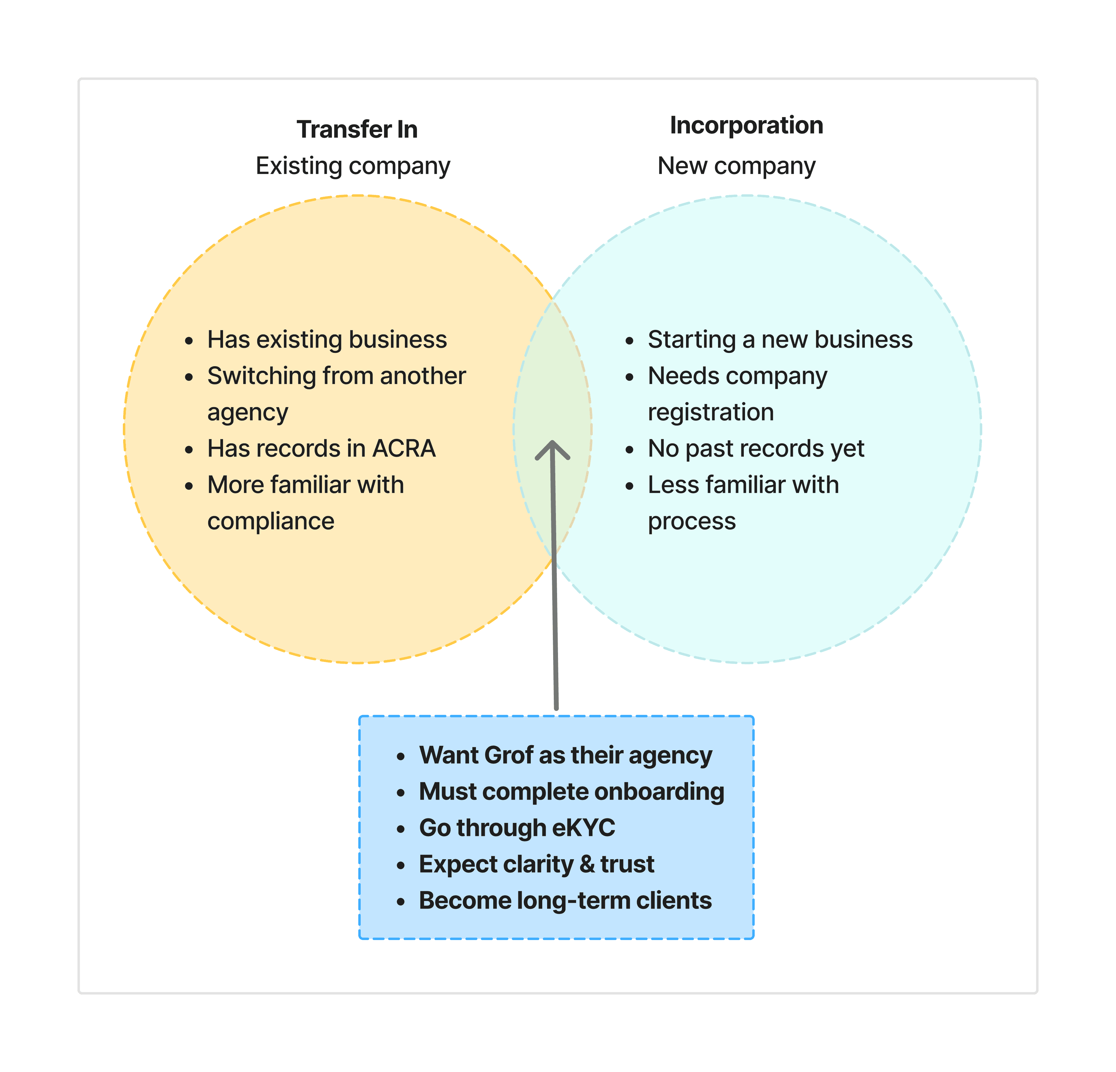 There are two types of clients: an existing company that wants to change its corporate agency (Transfer In) and a new company incorporated in Singapore (Incorporation).