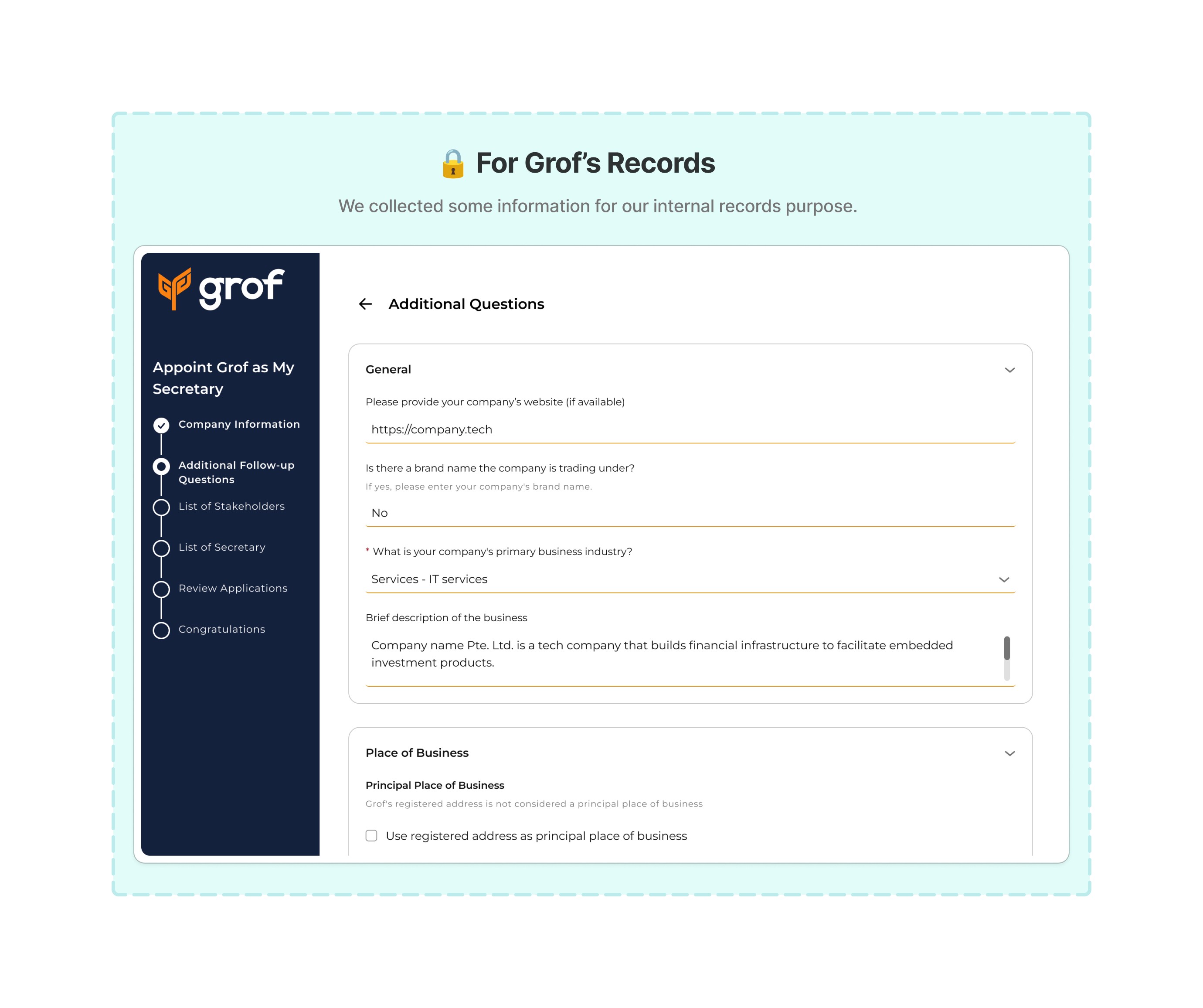 The onboarding process is a way for the service team to get to know the company and gather important and necessary information for government regulations, our partner, and Grof’s needs.