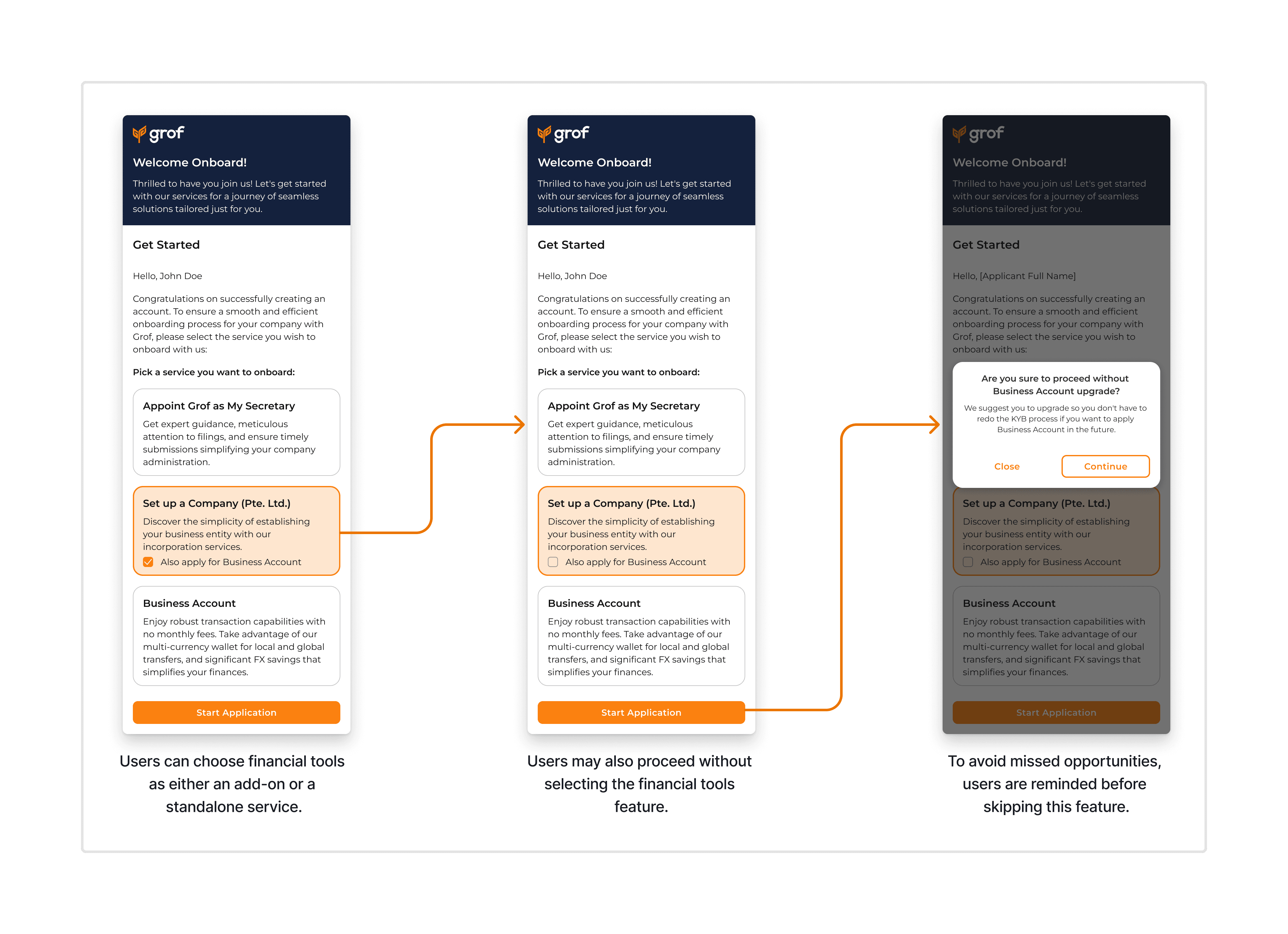 Image: Introducing Grof’s financial tools at the start of the onboarding journey, helping users understand the full value of our services from day one.