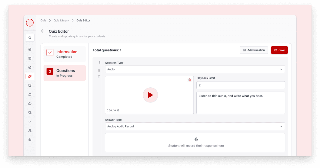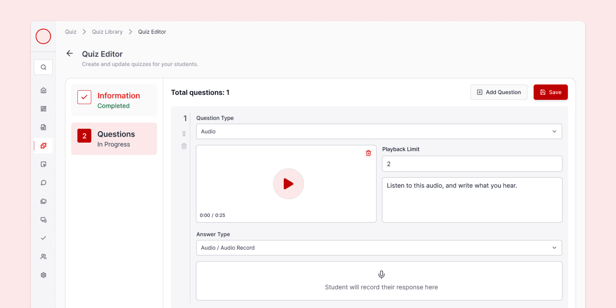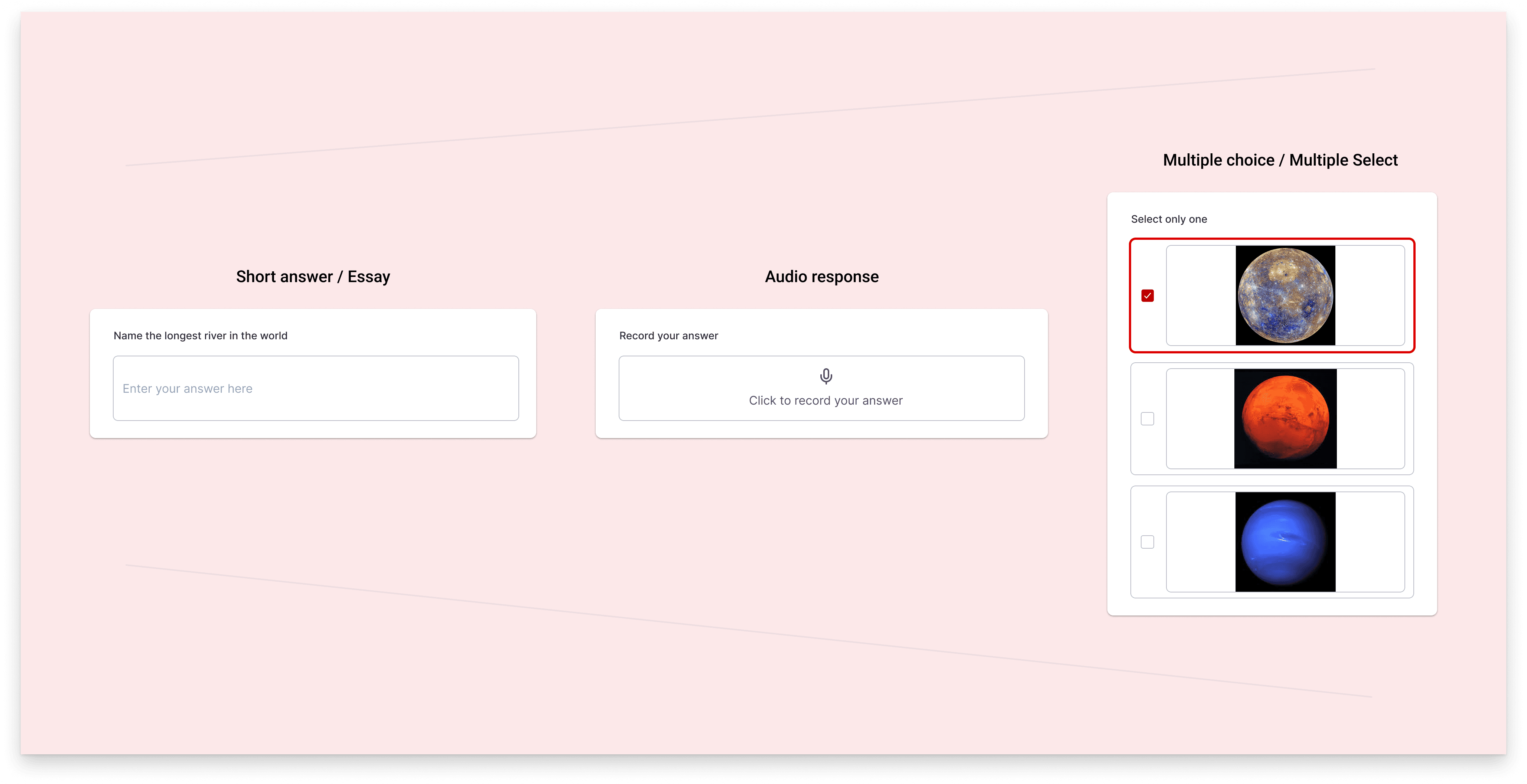 Students receive the same questions prepared by the teacher and can respond using various formats like text, audio, multiple choice, or multiple select.